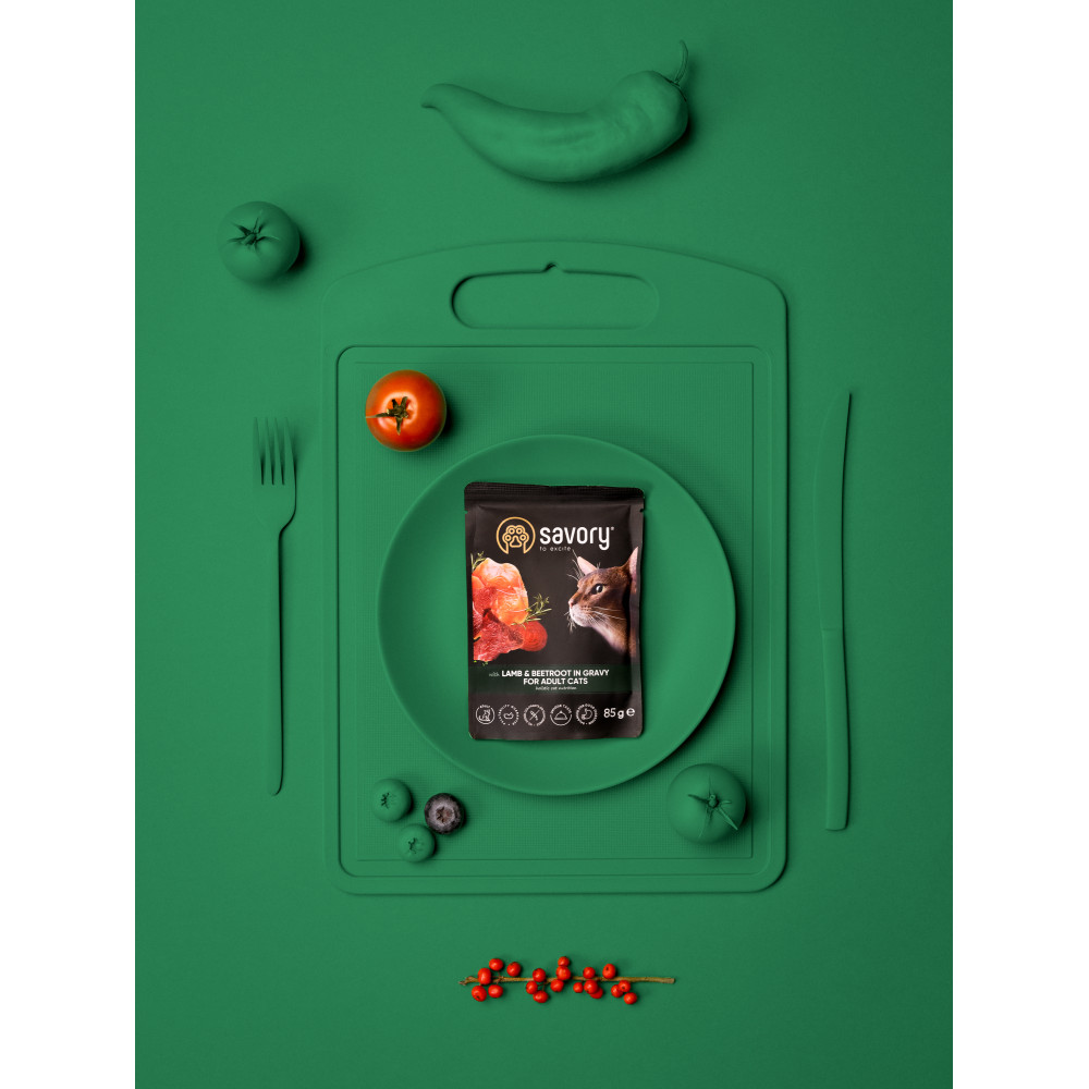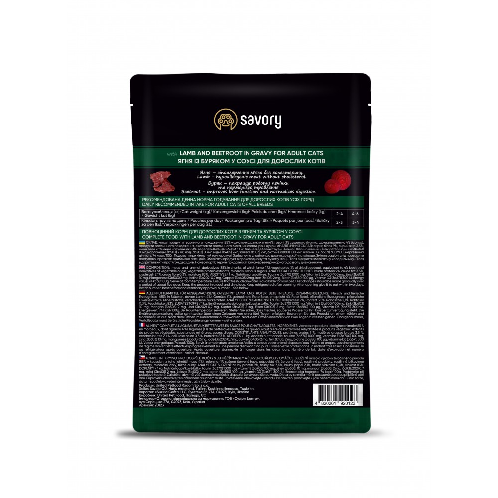 Повноцінний вологий корм суперпреміум класу для дорослих котів "Savory шматочки ягняти з буряком в соусі". Для самостійного або комбінованого із сухим кормом харчування улюбленців старше 1 року.