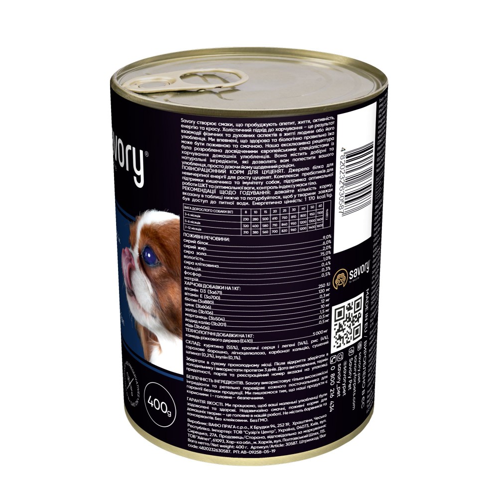 Повнораціонний вологий корм з кроликом і куркою для цуценят усіх порід. Корм для цуценят Savory пробудить у вашого улюбленця ту життєву енергію, про яку він навіть сам ще не знав.