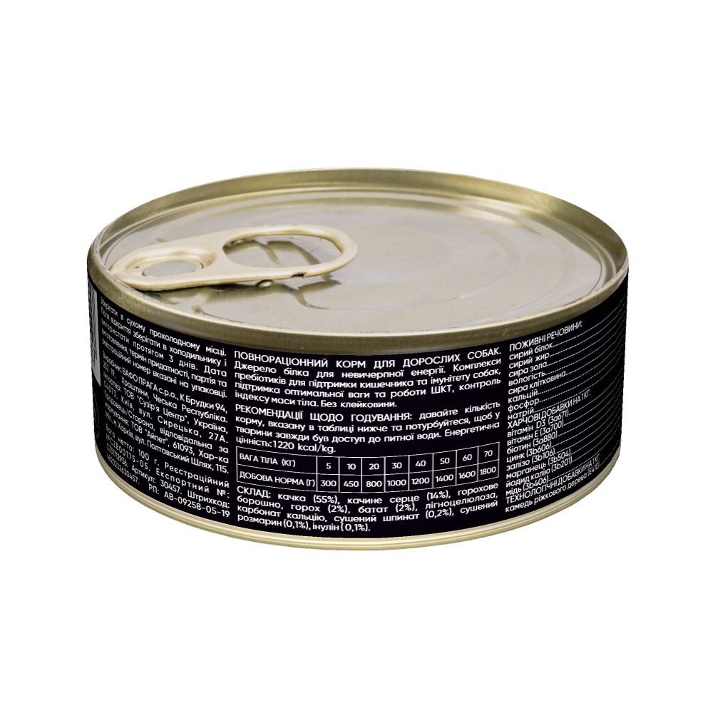 Склад: качка (55%), качині серця (14%), горохове борошно, горох (2%), солодка картопля (2%), лігноцелюлоза (органічна клітковина), карбонат кальцію, сушений шпинат (0,2%), сушений розмарин (0,1%), пребіотик інулін (0,1%).
