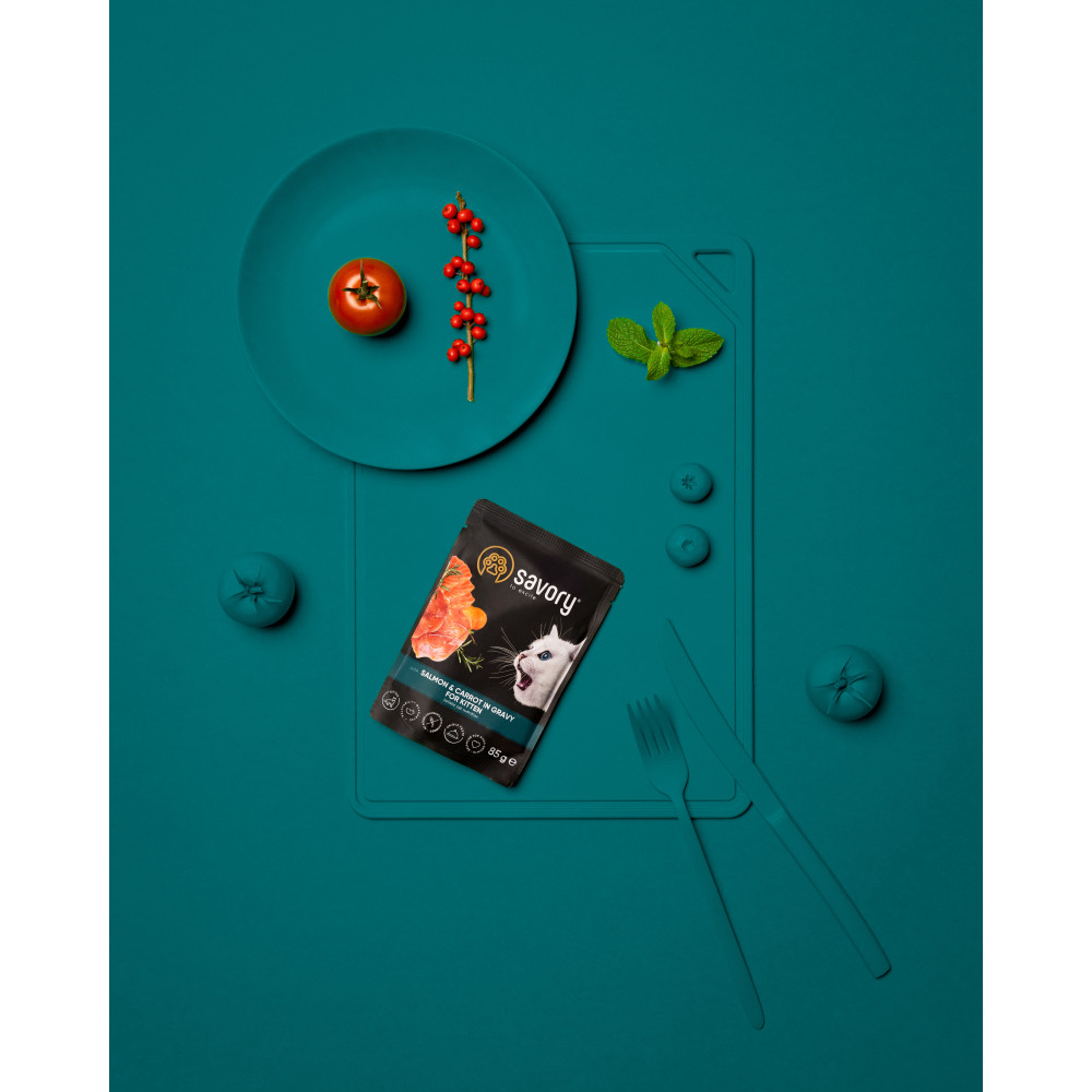 Повноцінний вологий корм суперпреміум класу для кошенят "Savory шматочки лосося з морквою в соусі". Для самостійного або комбінованого із сухим кормом харчування улюбленців до 1 року.