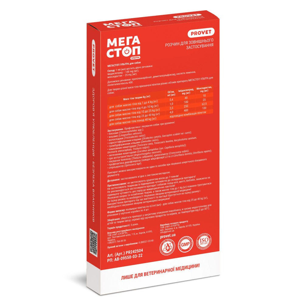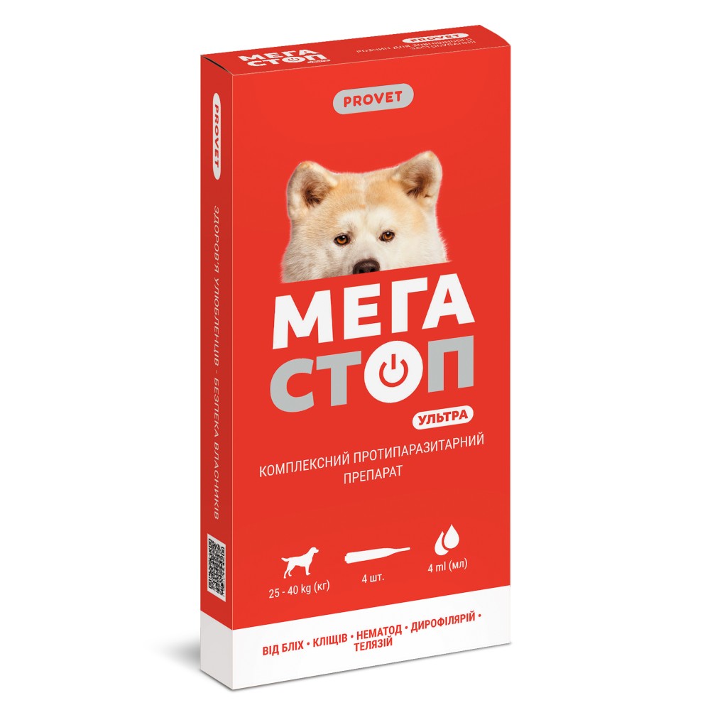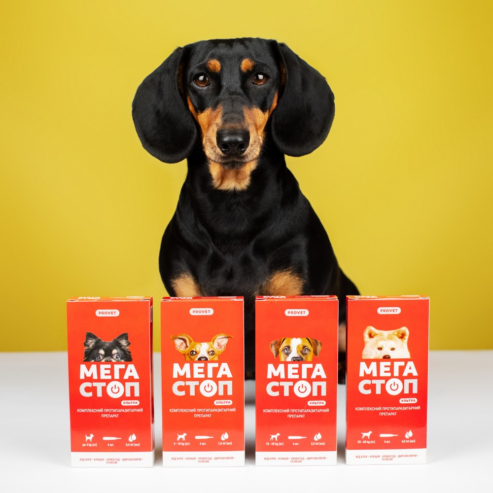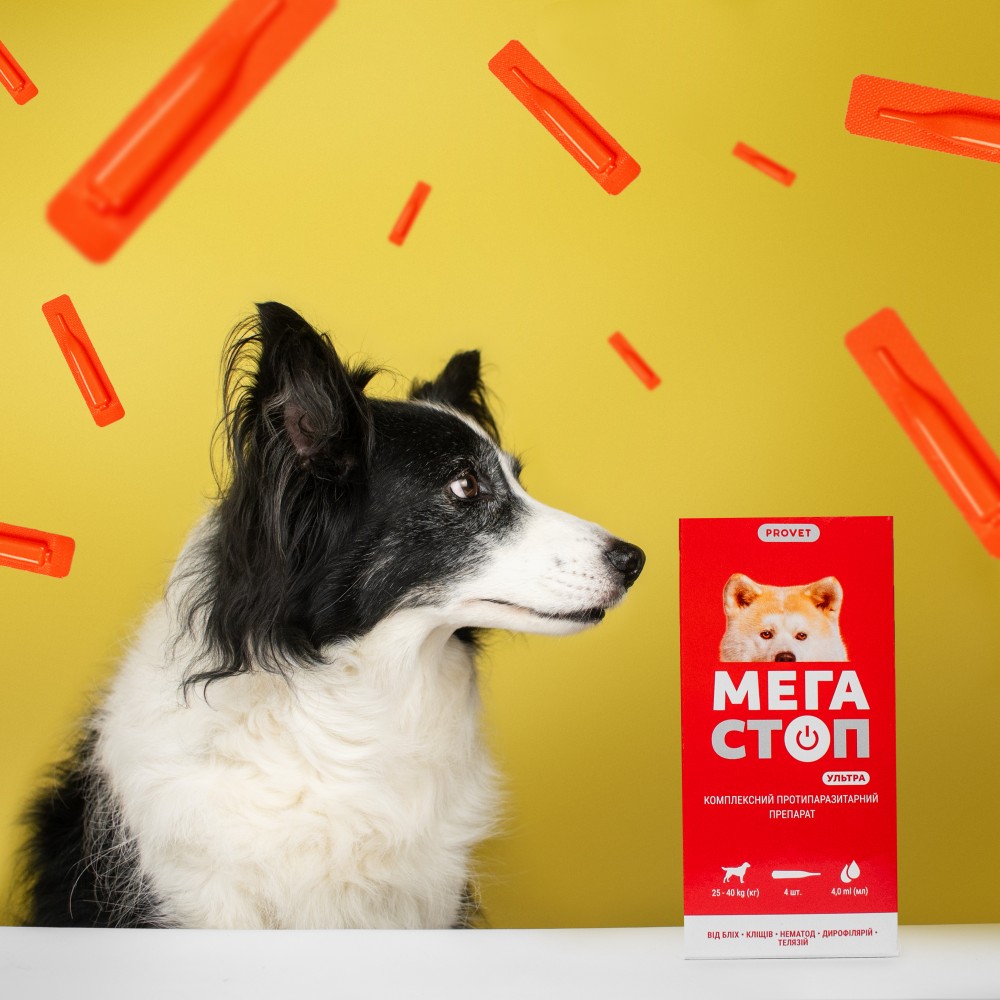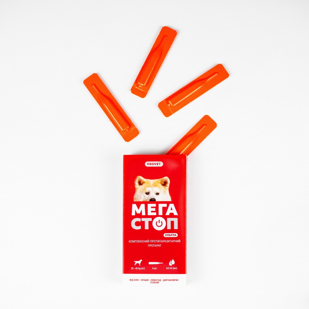 Великим собакам масою тіла понад 25 kg (кг) вміст піпетки наносити на шкіру у 3-4 точки вздовж хребта, від холки до хвоста.