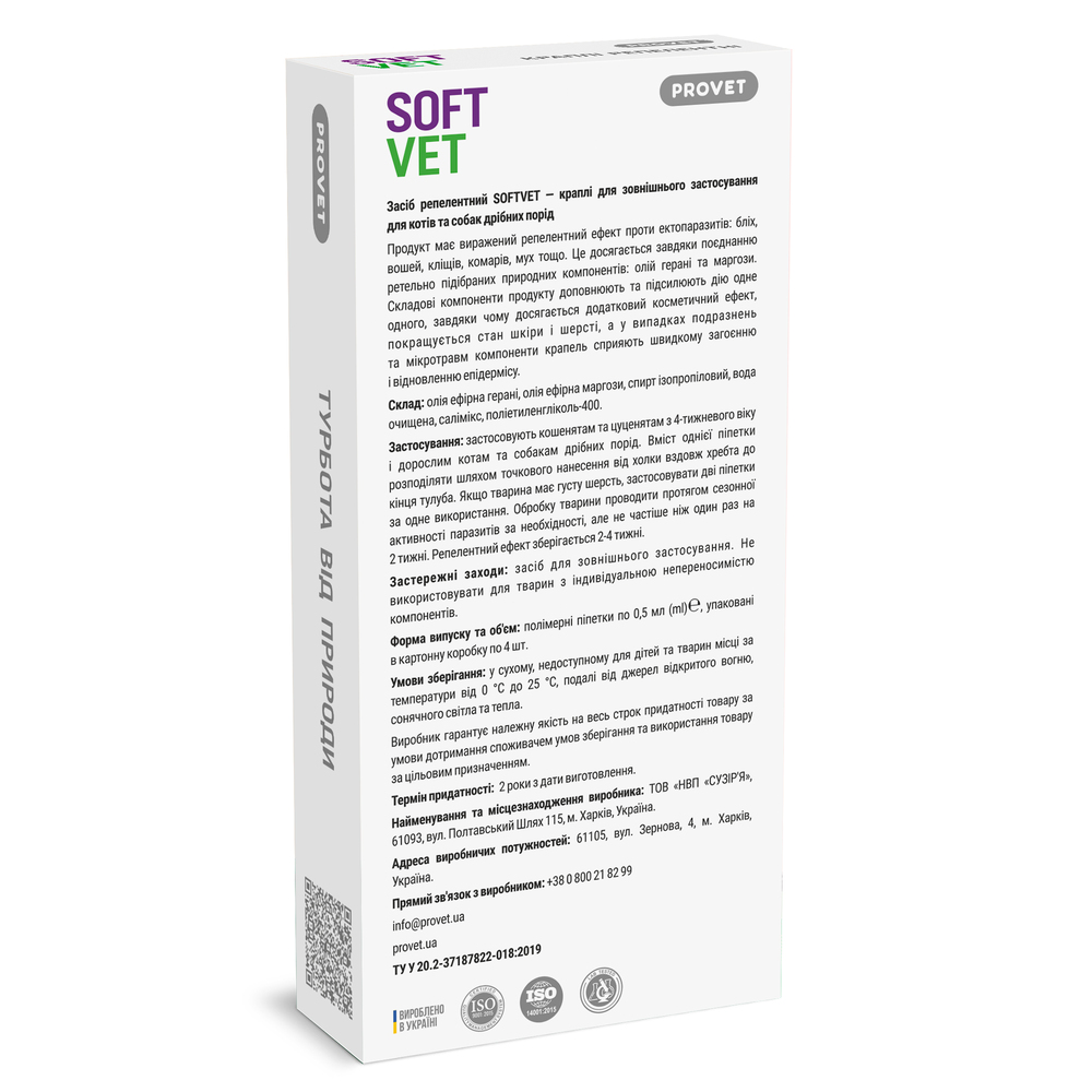 Краплі для зовнішнього застосування SОFTVET мають виражений репелентний ефект проти ектопаразитів: бліх, вошей, кліщів, комарів, мух тощо. Це досягається завдяки поєднанню ретельно підібраних природних компонентів: олій герані та маргози.