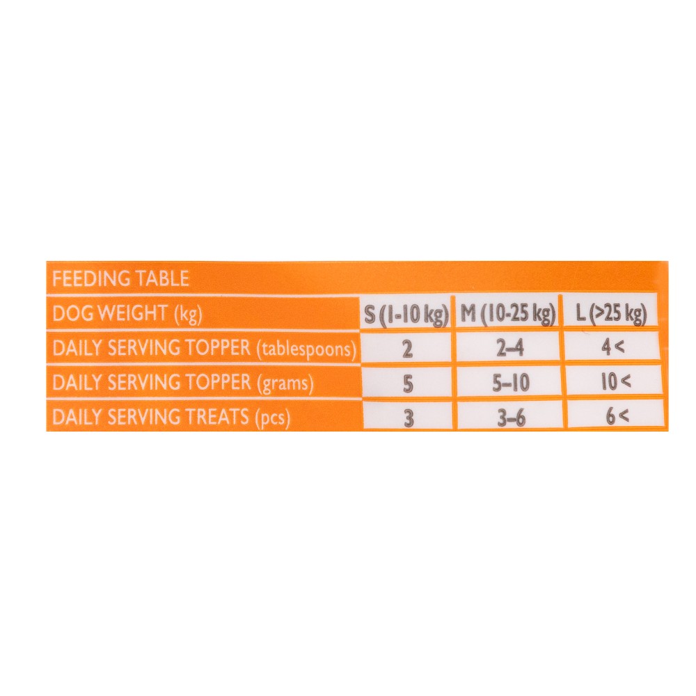 Рекомендації щодо годування: подавайте щодня з сухим кормом для покращення смаку. Ці ласощі не є заміною повноцінного раціону. Зверніть увагу, що харчова цінність 100 г ліофілізованого продукту еквівалентна 300 г сирого свіжого м’яса.