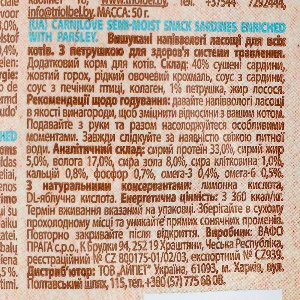 Carnilove Semi-Moist Sardine enriched with Parsley – вишукані напіввологі ласощі з сардиною та петрушкою для котів. Ці снеки мають беззернову рецептуру та сприяють здоров’ю системи травлення. Є прекрасним варіантом, щоб пригостити котика чимось смачненьким або для його заохочення.