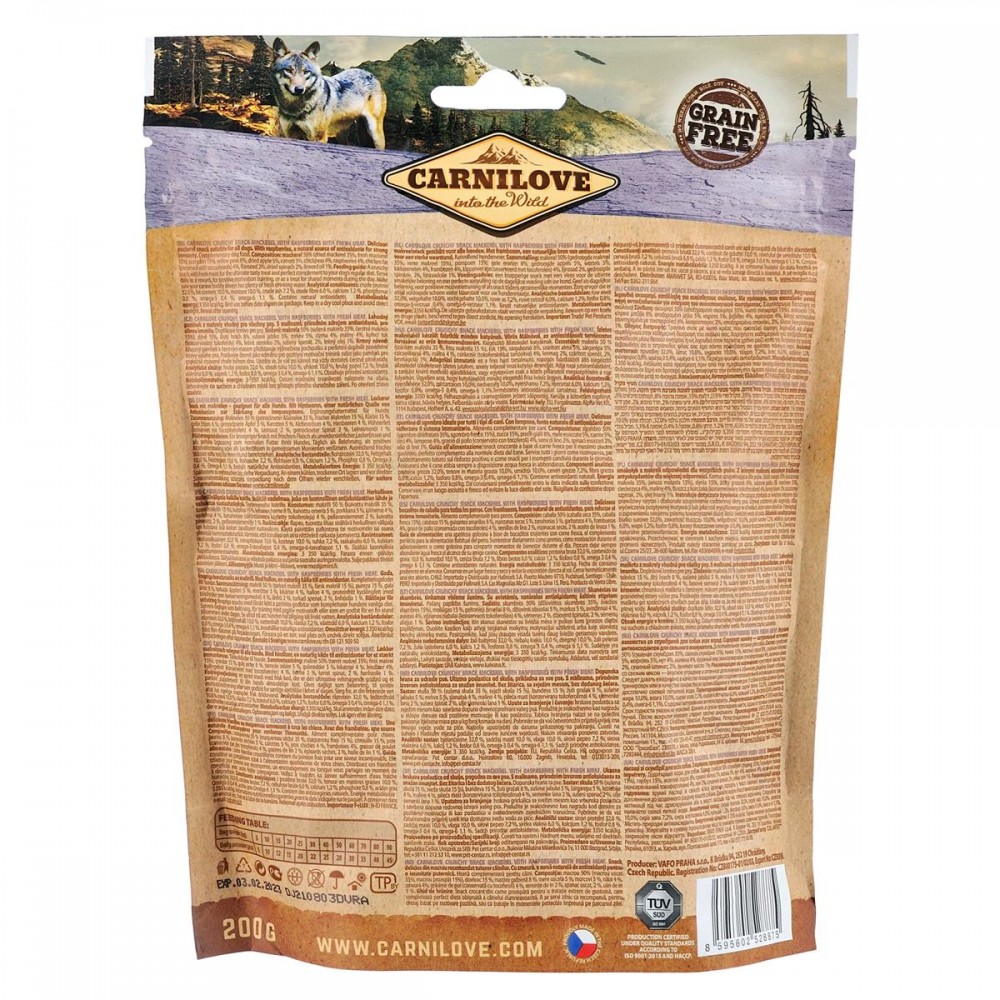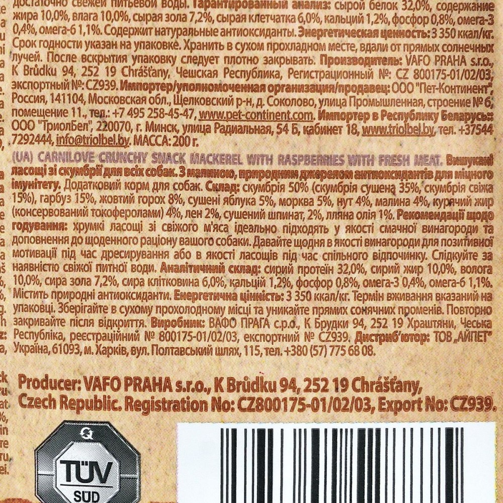 Carnilove Crunchy Mackerel with Raspberries – вишукані ласощі зі свіжою скумбрією і малиною для собак. Снеки мають беззернову рецептуру, а малина є природним джерелом антиоксидантів для міцного імунітету.