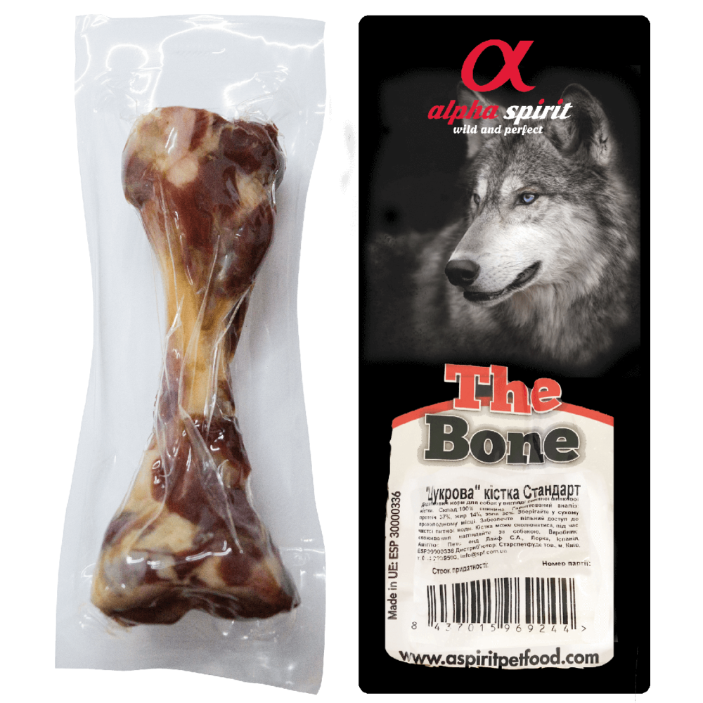 Кістка Альфа Спіріт – це 100% справжня іспанська шинкова кістка Хамон Серано, термічно оброблена і висушена на відкритому повітрі, зі збереженням всіх своїх корисних властивостей та смакових якостей.