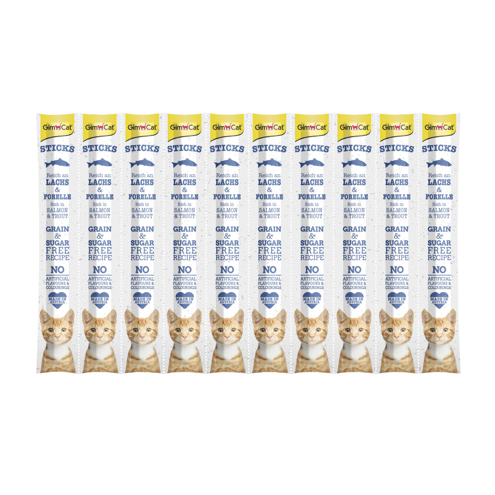 GimCat Sticks Salmon & Troutn – це смачнючі ласощі для котиків. Ретельно підібраний рецепт містить лосось і форель, а також вітаміни та таурин. Рецептура настільки наповнена корисними інгредієнтами, що в ній немає місця для доданого цукру, зерна, штучних барвників чи ароматизаторів.