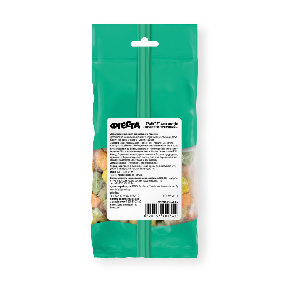 Склад: овес, пшениця, ячмінь, арахіс, сушені яблука, сушені лимони, тонконіг луговий, кропива, кокосова стружка
