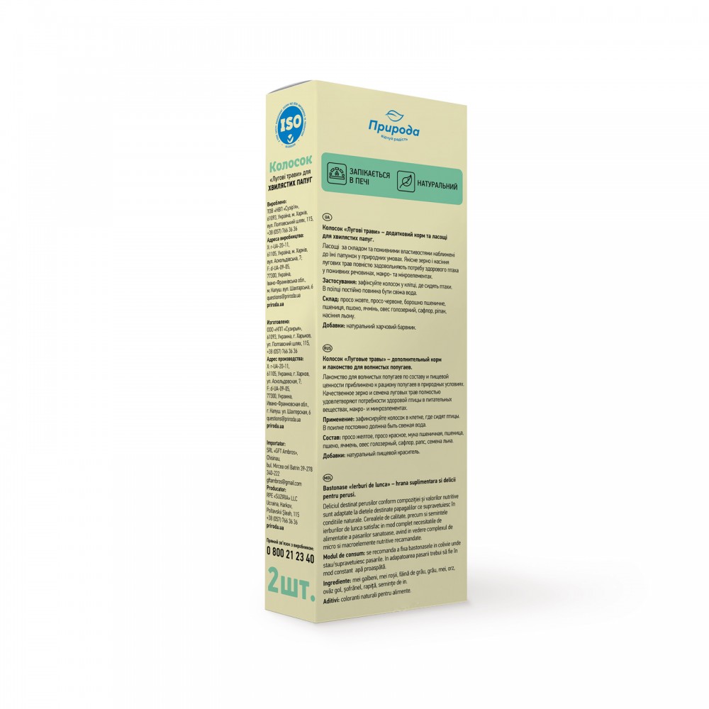 Повноцінні вітамінізовані ласощі мають високу поживну цінність і смакові якості завдяки спеціальній технології обробки інгредієнтів. Склад колосків наближений до їжі папуг в природних умовах. Добірні зерна забезпечують птахів енергією.