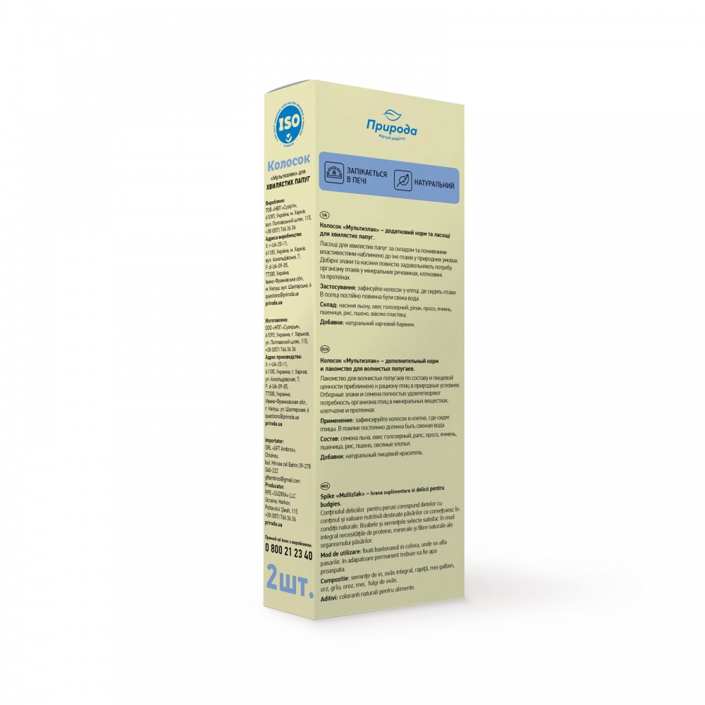 Колосок «Мультизлак» – повноцінний вітамінізований корм та ласощі для хвилястих папуг. Ласощі для хвилястих папуг за складом та поживними властивостями наближено до їжі птахів у природних умовах. Добірні злаки та насіння повністю задовольняють потребу організму птахів у мінеральних речовинах, клітковиніта протеїнах.