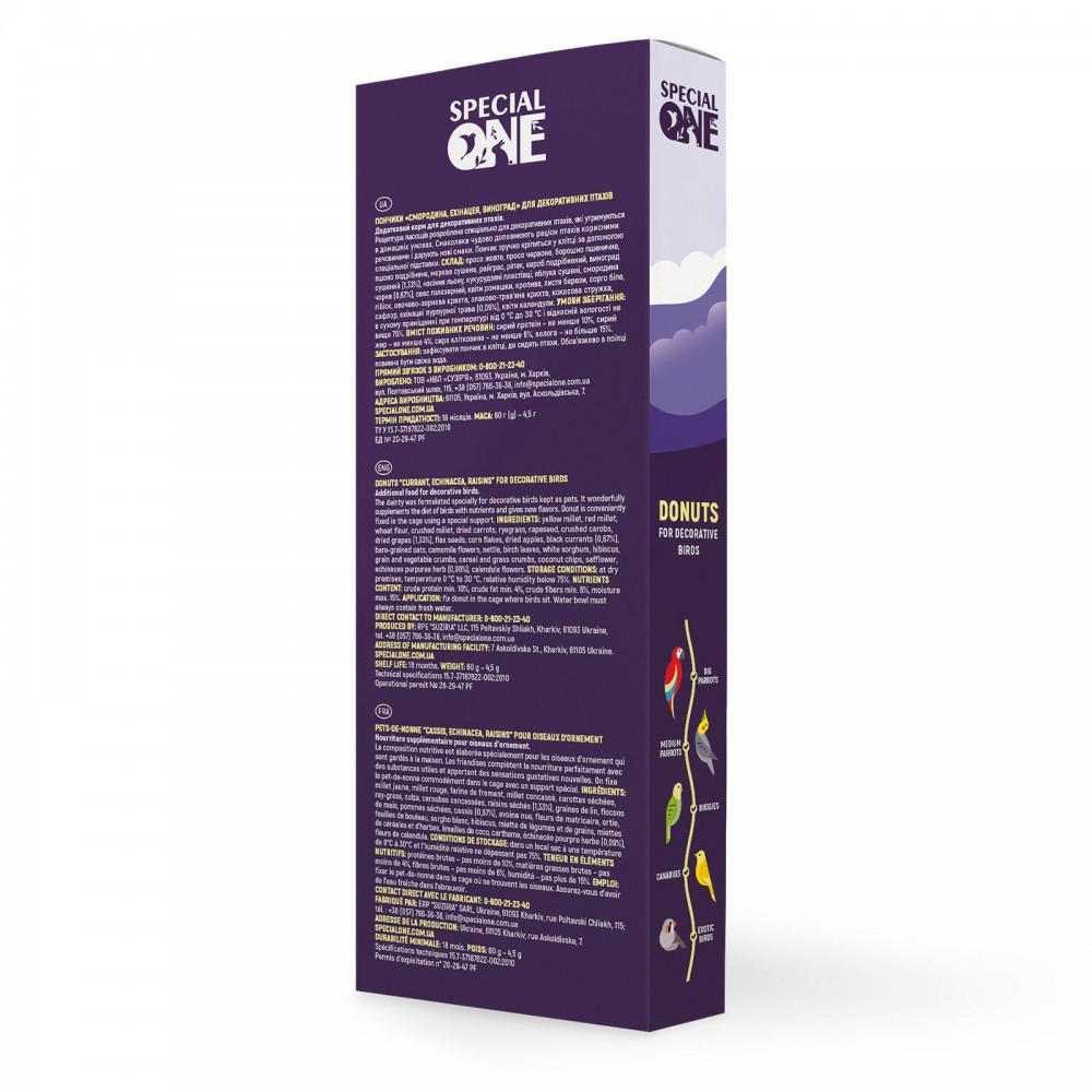 Рецептура ласощів розроблена спеціально для декоративних птахів, які утримуються в домашніх умовах. Смаколики чудово доповнюють раціон птахів корисними речовинами і дарують нові смаки. Виноград, гібіск, ромашка, ехінацея та смородина є джерелом вітамінів, підвищують опірність інфекціям. Пончик зручно кріпиться у клітці за допомогою спеціального тримача.