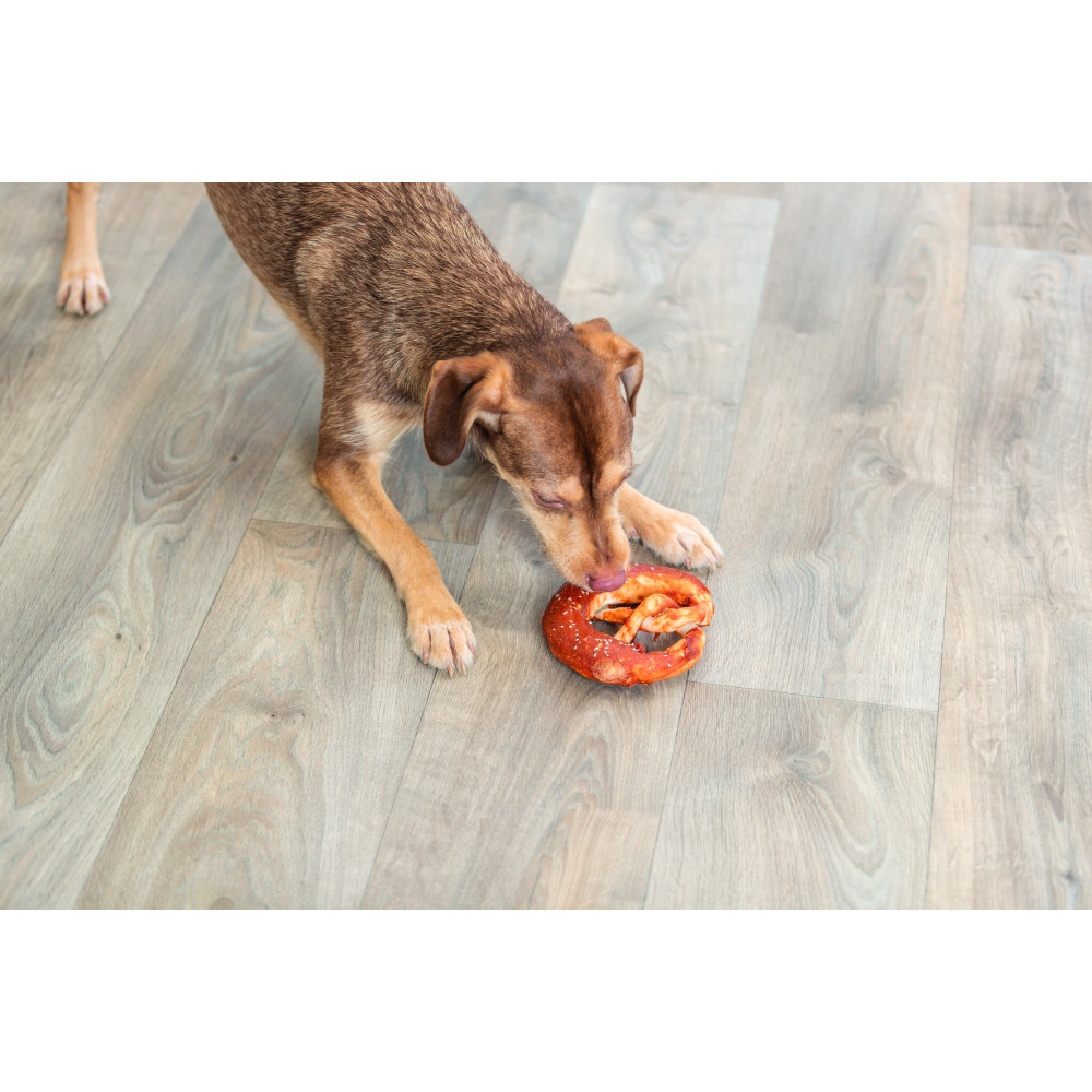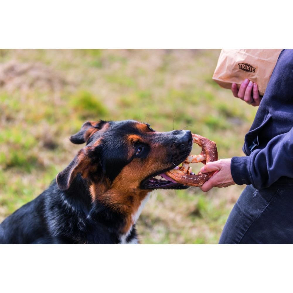 Запропонуйте йому ласощі Trixie Denta Fun Duck Pretzel. Це кренделі виготовлені із сиром’ятної шкіри, загорнутої в м'ясо качки. Для них використовується особливо товста шкіра, це значно продовжує задоволення від жування для вашого улюбленця.
