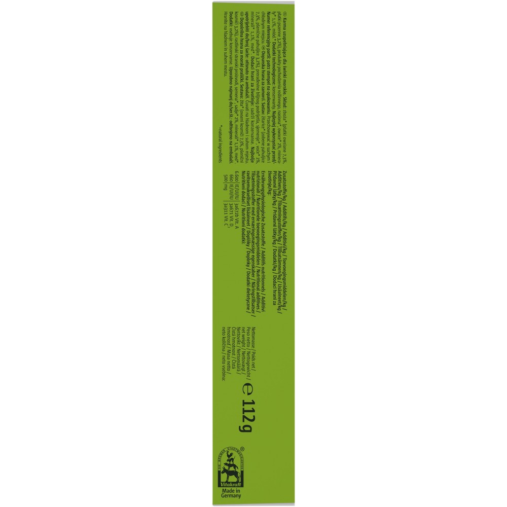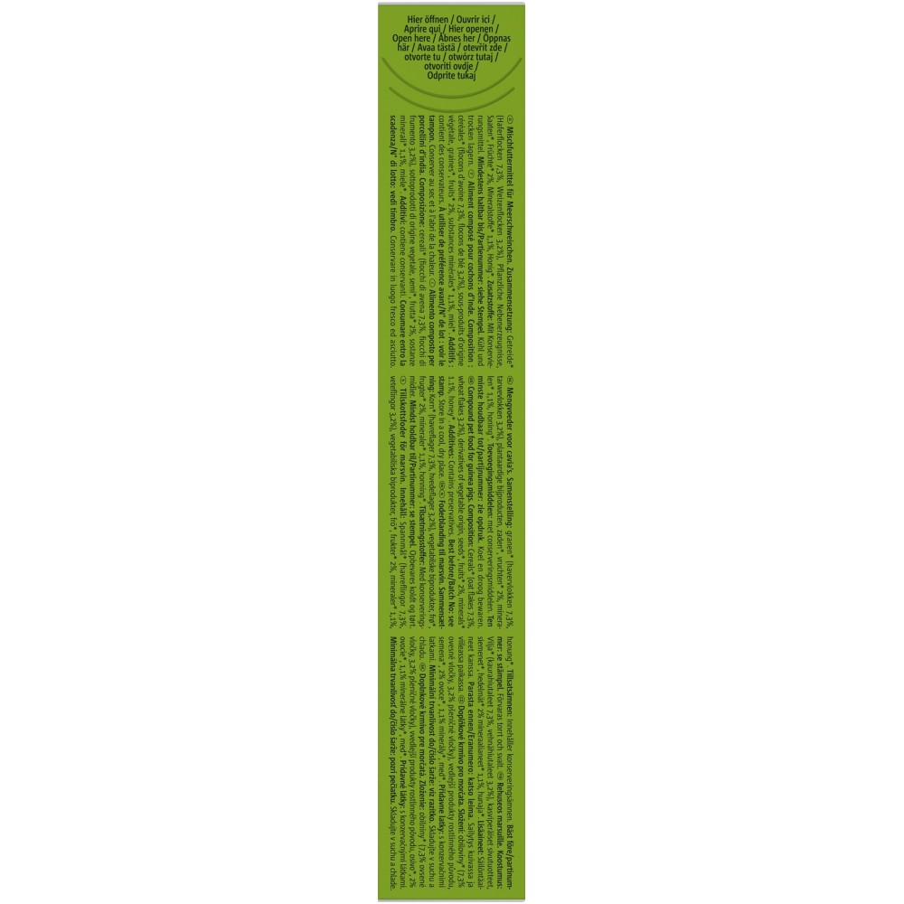 Склад: злаки (пшеничні пластівці 3.2%, вівсяні пластівці 7.3%), продукти рослинного походження, насіння, фрукти - 2%, мінерали, мед.