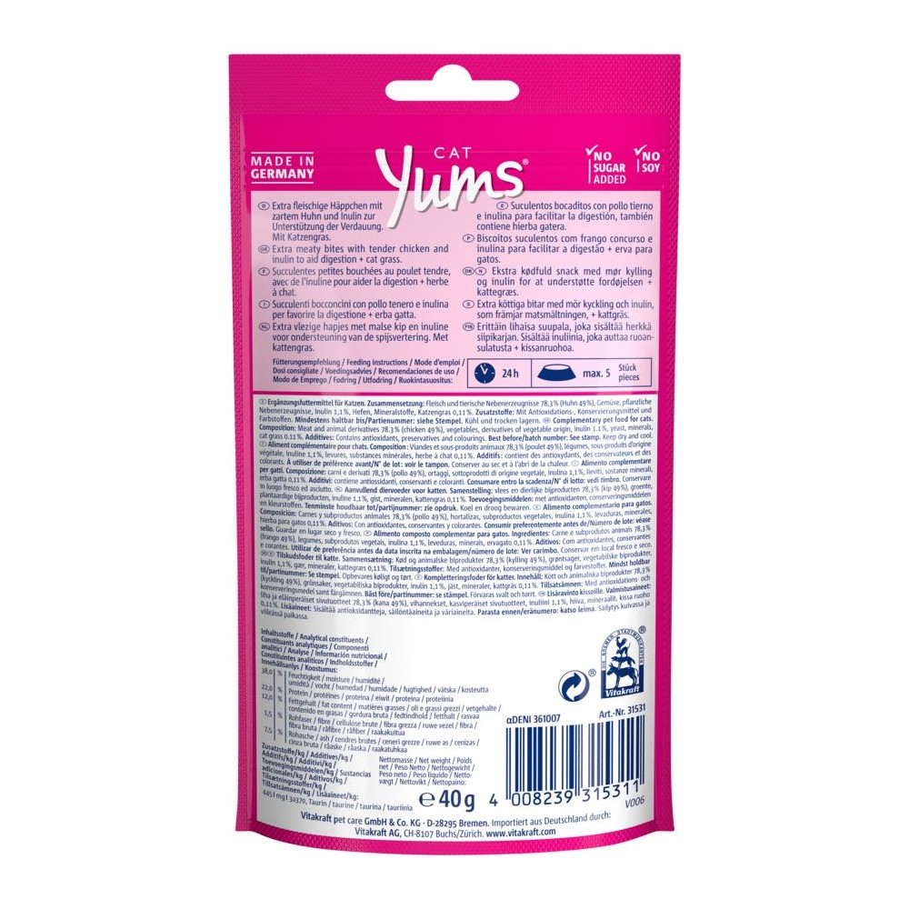 Мммм... смачно! Екстрам’ясні ласощі Vitakraft Cat Yums® + Huhn & Katzengras з ніжною курочкою та котячою м’ятою мають унікальний процес приготування – з відбірних інгредієнтів, без цукру та без додавання зерна чи сої. Інулін, який міститься в ласощах підтримує здорову мікрофлору кишківника і, відповідно, зміцнює імунітет.
