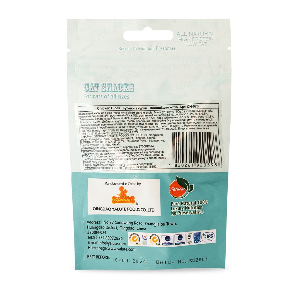 Снеки Yalute – новий стандарт ласощів для котів. Апетитні кубики виготовляють з відбірного м'яса курки та інших природних складників. Тому ці закуски мають чудовий смак і підтримують відмінну фізичну форму улюбленців.