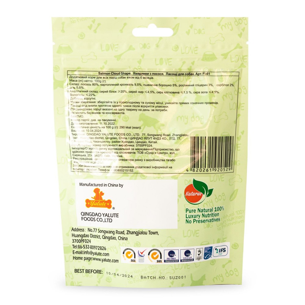 Снеки Yalute – новий стандарт ласощів для собак. Апетитні хмаринки виготовляють з відбірного лосося та додають інші природні складники. Тому ці закуски мають чудовий смак, покращують імунітет і підтримують фізичну форму улюбленців.