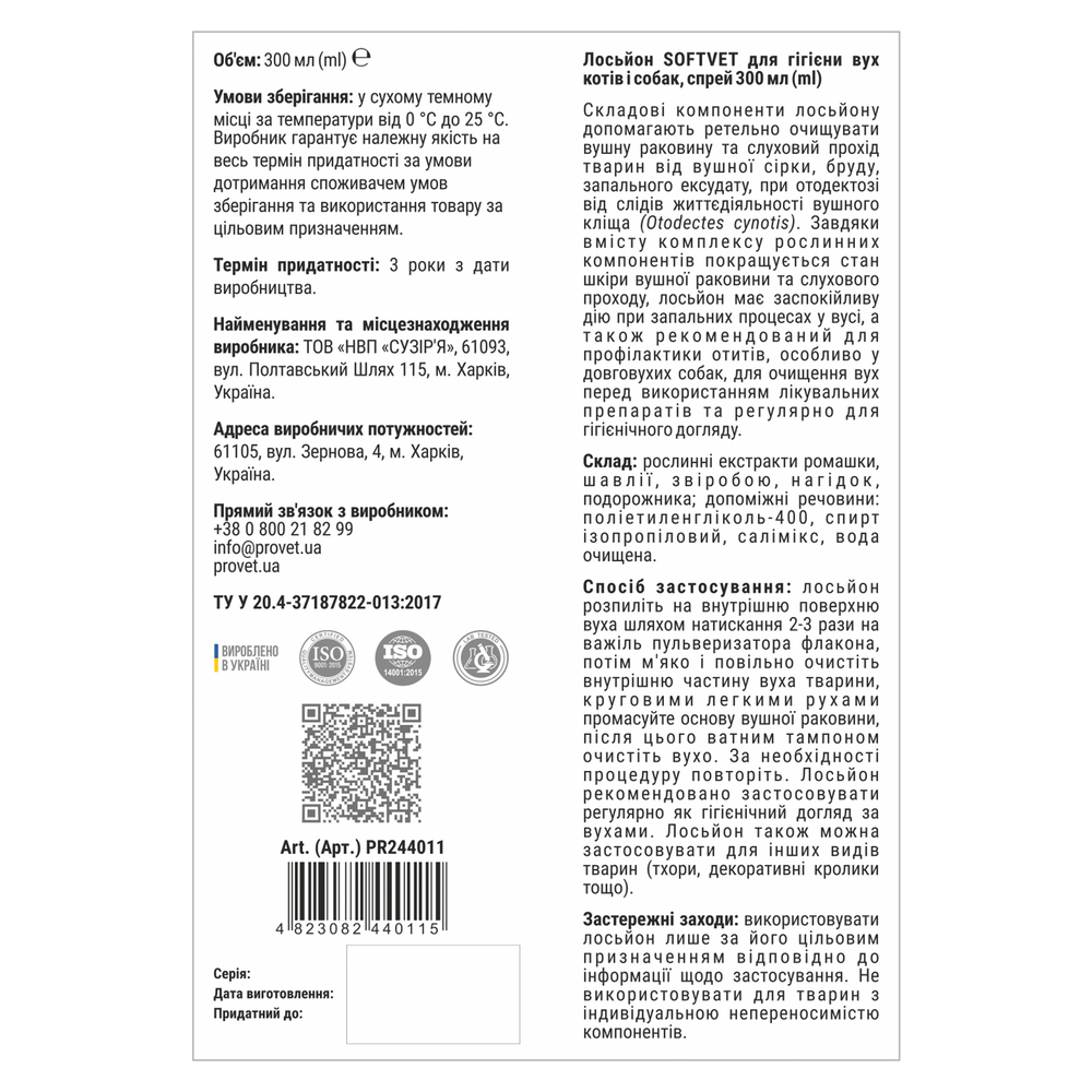 Лосьйон Provet SOFTVET для гігієни вух котів і собак 300 мл
