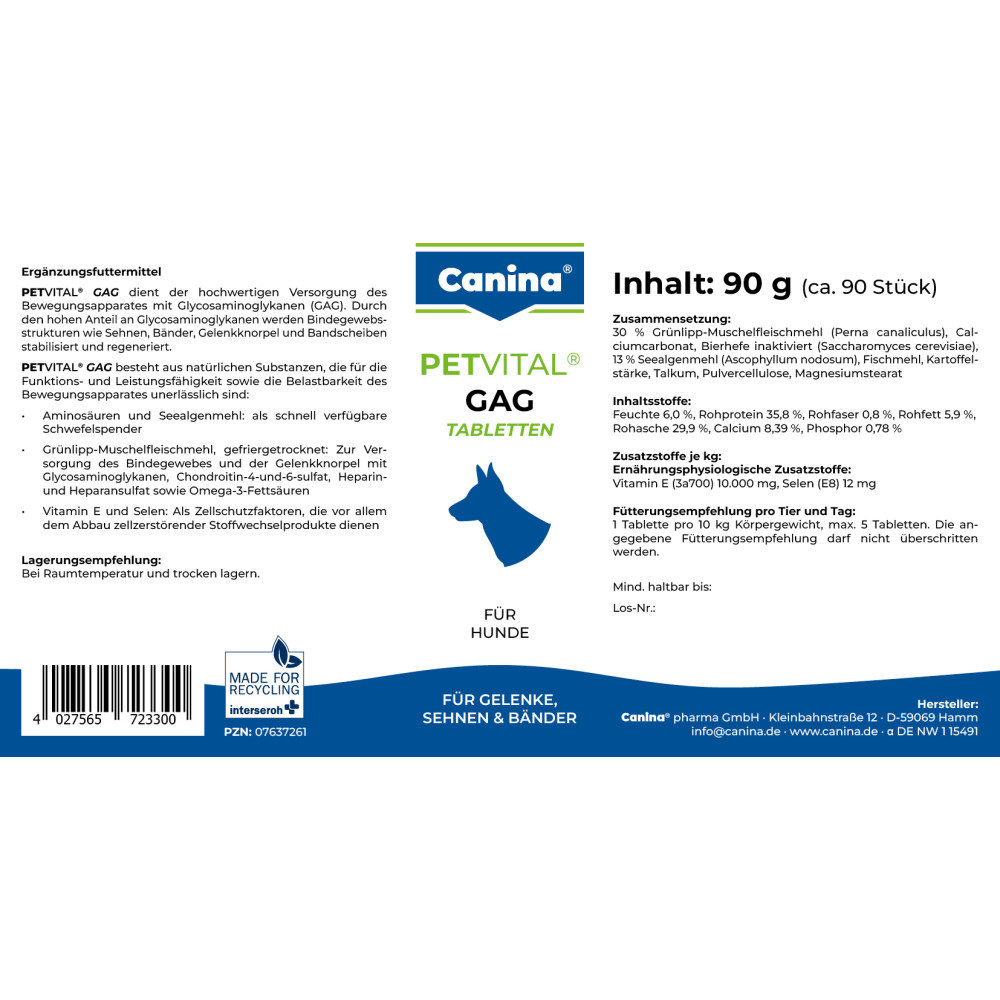 Мінеральний комплекс Canina Petvital GAG для собак для суглобів і тканин глюкозамін з екстрактом мідій 90 г 90 табл.