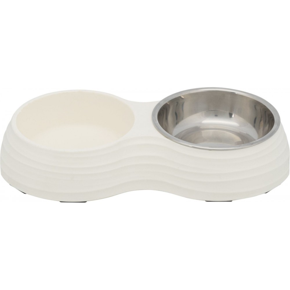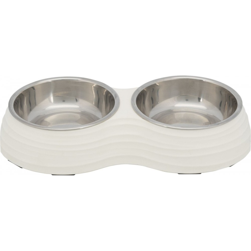 Комплект Trixie із 2-ох мисок – це дуже практичне рішення, адже у вашого песика відразу з’являється посуд і для води, і для їжі. Стійка основа із меламіну не дає мискам перекидатися і надає комплекту привабливого вигляду.