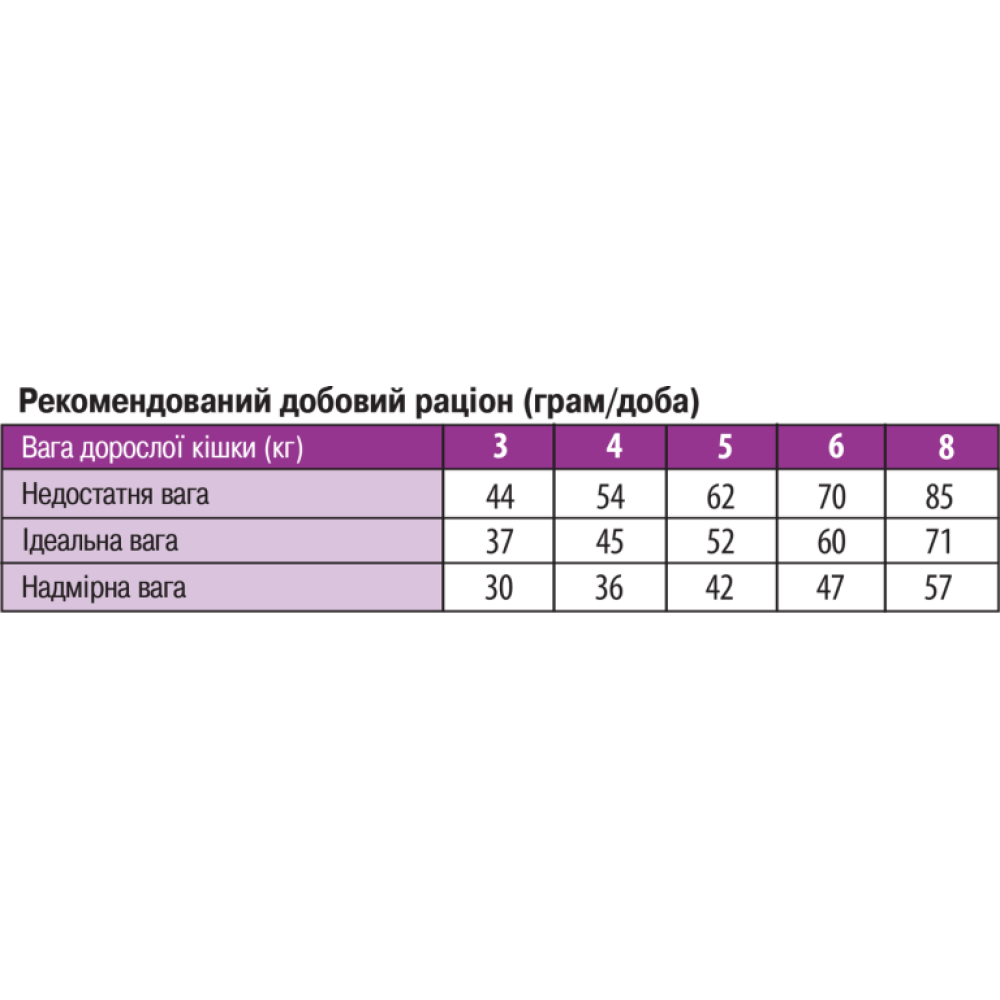 Гарантований аналіз: сирий білок 33,00%, сирі масла і жири 14,00%, сира клітковина 2,50%, сира зола 6,50%, кальцій 1,80%, фосфор 1,20%, омега-6 незамінні жирні кислоти 7,00%, омега-3 незамінні жирні кислоти 0,80%.