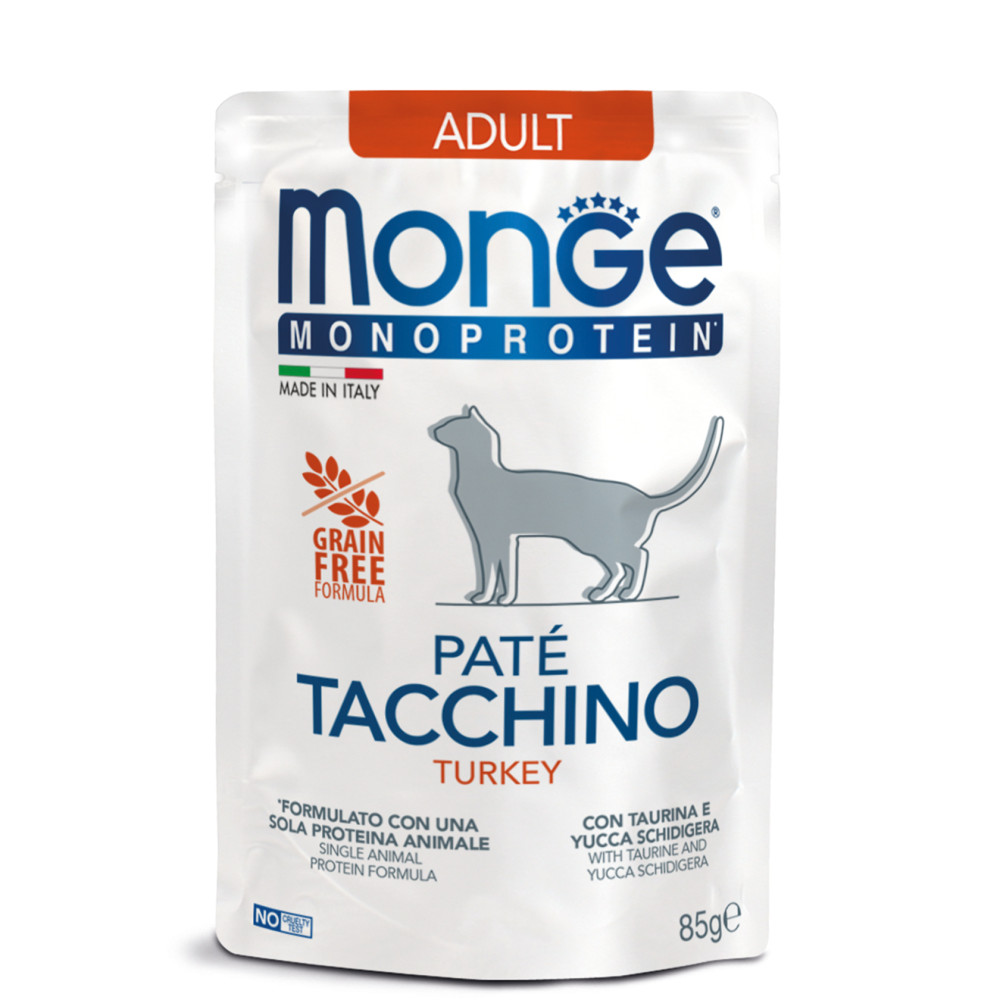 Monge Monoprotein Tacchino- паучі для дорослих кішок з індичкою – це повноцінний збалансований раціон з м'яса індички для дорослих кішок з особливими потребами.