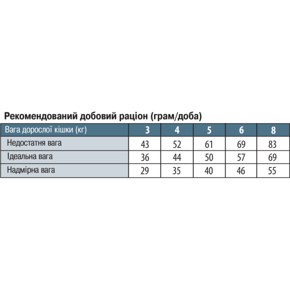 Рекомендації по годівлі: Рекомендовану щоденну порцію корму можна розділити на два прийоми (див. Таблицю). Індивідуальні потреби в харчуванні можуть відрізнятися в залежності від розміру, віку та рівня активності тварини. Дані приписи носять виключно рекомендаційний характер. Для досягнення оптимального стану тварини може знадобитися зміна раціону. Перехід на новий вид корму повинен відбуватися протягом тижня. Свіжа чиста вода повинна постійно бути доступна вашому вихованцеві.