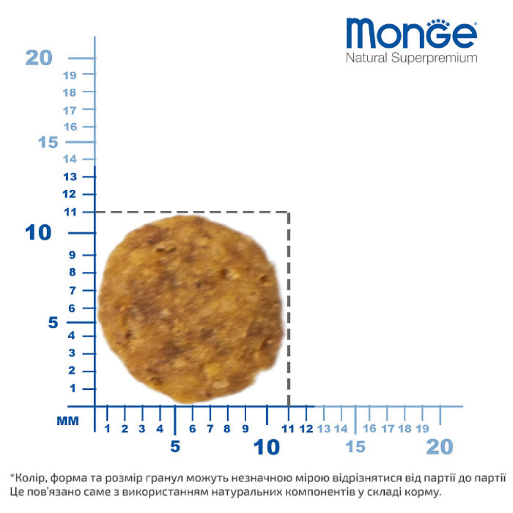 Гарантований аналіз: сирий білок 33,00%, сирі масла і жири 14,00%, сира клітковина 2,50%, сира зола 6,50%, кальцій 1,80%, фосфор 1,20%, омега-6 незамінні жирні кислоти 7,00%, омега-3 незамінні жирні кислоти 0,80%.