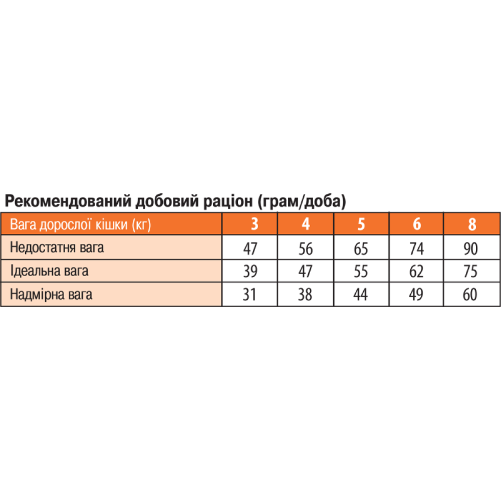 Рекомендації по годівлі: Рекомендовану щоденну порцію корму можна розділити на два прийоми. Індивідуальні потреби в харчуванні можуть відрізнятися в залежності від розміру, віку та рівня активності тварини. Дані приписи носять виключно рекомендаційний характер. Для досягнення оптимального стану тварини може знадобитися зміна раціону. Перехід на новий вид корму повинен відбуватися протягом тижня. Свіжа чиста вода повинна постійно бути доступна вашому вихованцеві. Зберігати в сухому і прохолодному місці.
