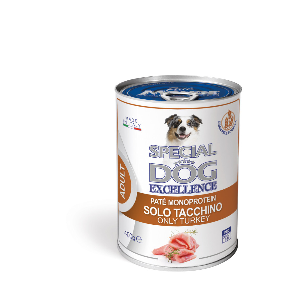 Special Dog Excellence Paté Monoprotein Only Turkey, розроблений з одного джерела тваринного білка (індичка) найвищої якості. Збереження продукту гарантується натуральною антиоксидантною добавкою. Додано вітаміни та мінерали для правильного споживання всіх поживних речовин дорослої собаки. Беззернова формула.