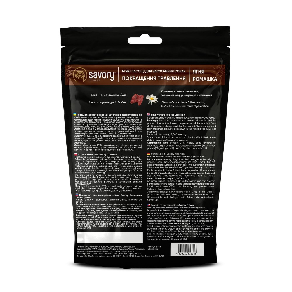 М'які ласощі Savory для дорослих собак усіх порід. Додаткове харчування, яке можна використовувати у якості заохочення та, як винагороду для улюбленця. Не тільки висока смакова привабливість, але й корисні складові, що є основою здорового харчування, роблять ласощі Savory ідеальним доповненням до основного раціону і частуванням для вашого улюбленця.