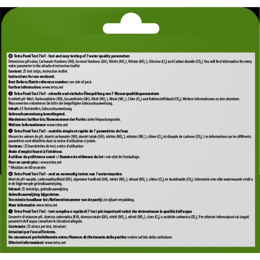 Рекомендації із застосування: Tetra Pond Test 7in1 дозволяє швидко й надійно визначити сім найважливіших показників води в декоративних ставках за один простий крок: занурте тест-смужку у воду, потримайте її протягом приблизно двох секунд і витріть надлишки води.