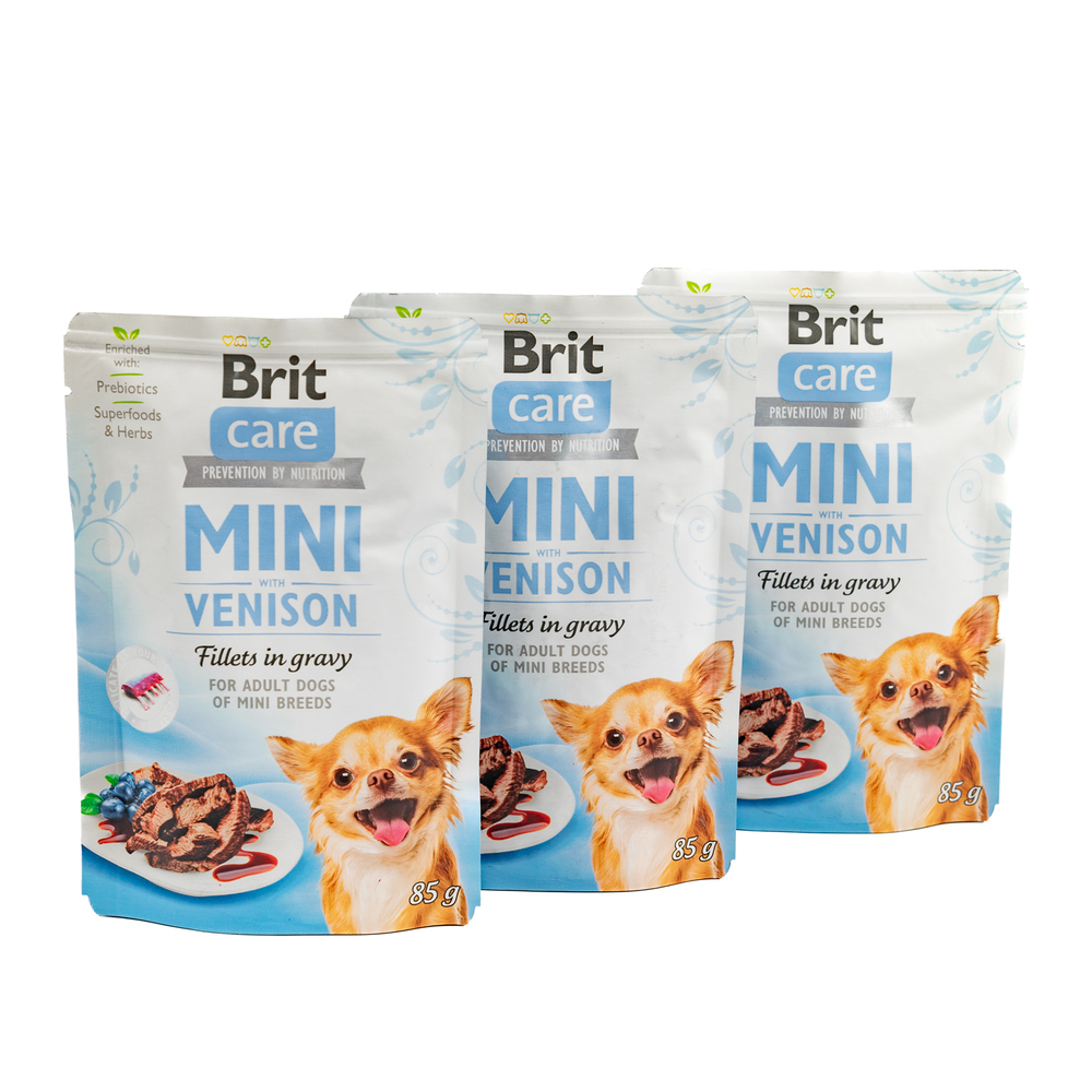 - Вологий корм Brit Care Mini Venison філе в соусі оленина (3 шт.*85 г) – ніжне філе оленини в апетитному соусі, яке доповнить раціон вашого улюбленця і зробить його харчування більш різноманітним.