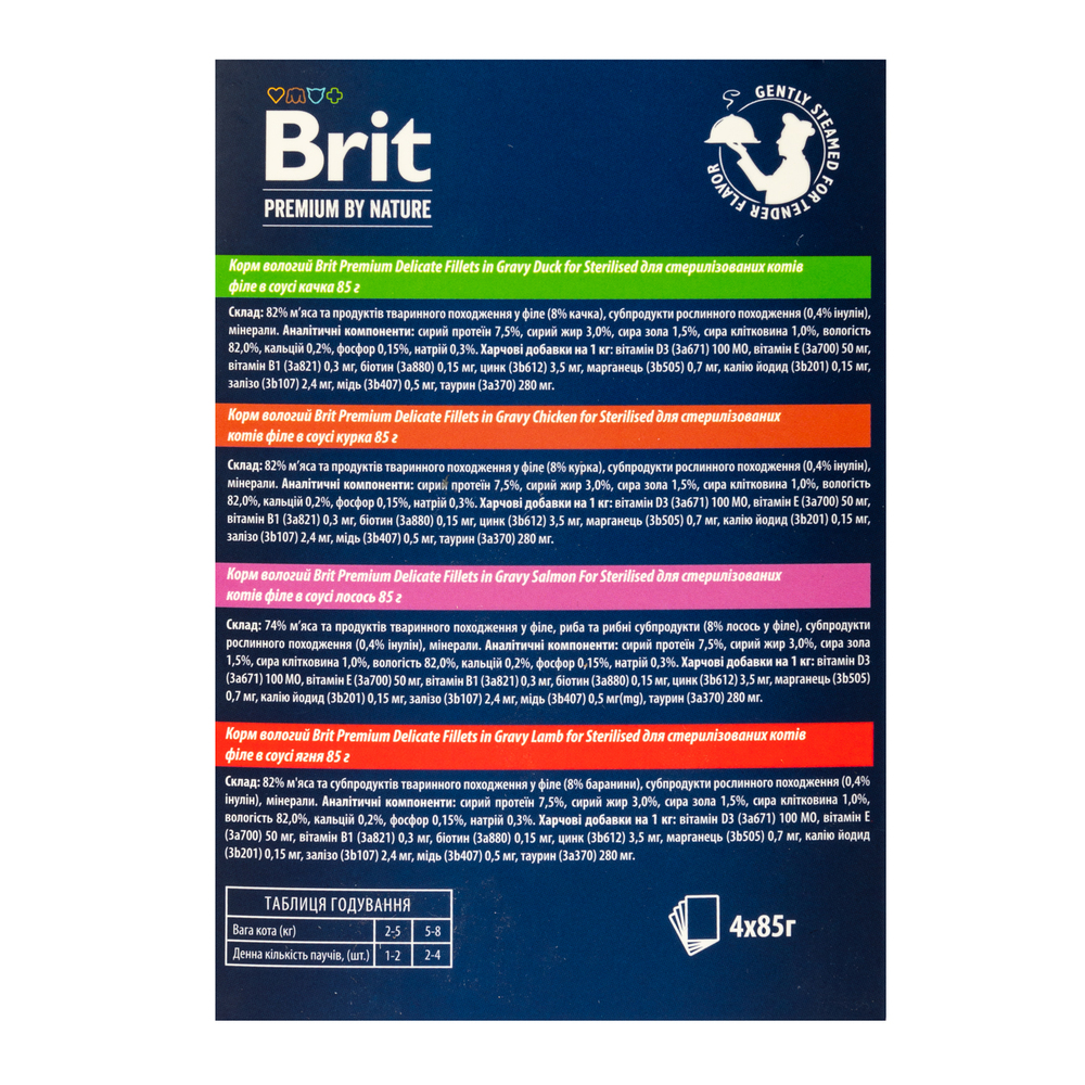 - Корм вологий Brit Premium Delicate Fillets in Gravy Duck for Sterilised для стерилізованих котів філе в соусі качка, 85 г