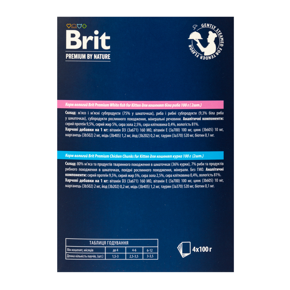 Набір «Корм вологий Brit Premium для кошенят курка+риба 3+1» складається із 4-ох паучів з вологими кормами преміум класу:
