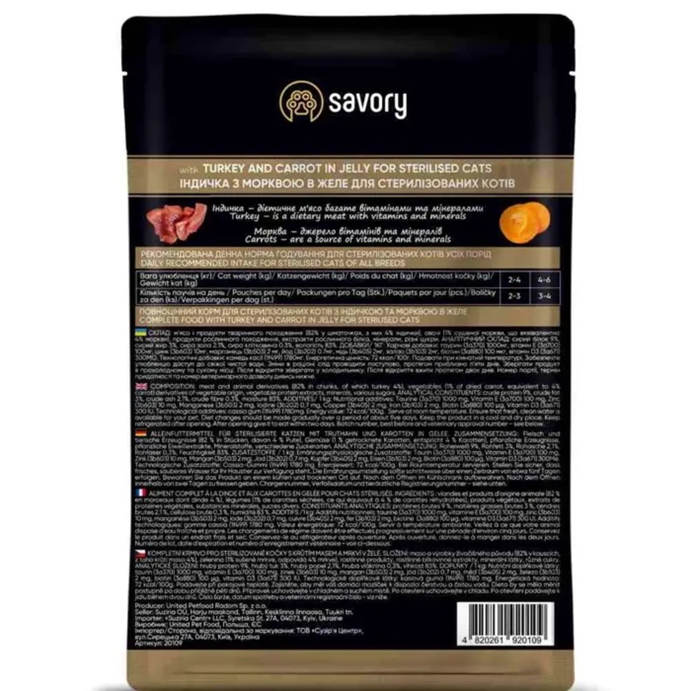Набір паучів Savory Sterilised "3+1" для стерилізованих котів, індичка з морквою в желе – це ще більше насолоди для вашого вусатого вихованця!