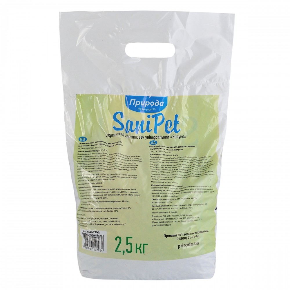 Продукт на 100% натуральний, не містить хімічних добавок, завдяки дезинфікуючим властивостям деревини хвойних порід уповільнює розвиток патогенних мікроорганізмів. Для виготовлення використовується виключно дрібна тирса без великих шматків кори та деревини, тому якщо тварина випадково проковтне наповнювач, це не завдасть шкоди. Заокруглені гранули не травмують лапи, не створюють пил, мають приємний аромат яблука. Наповнювач особливо рекомендований кошенятам, яких тільки-но починають привчати до лотка.