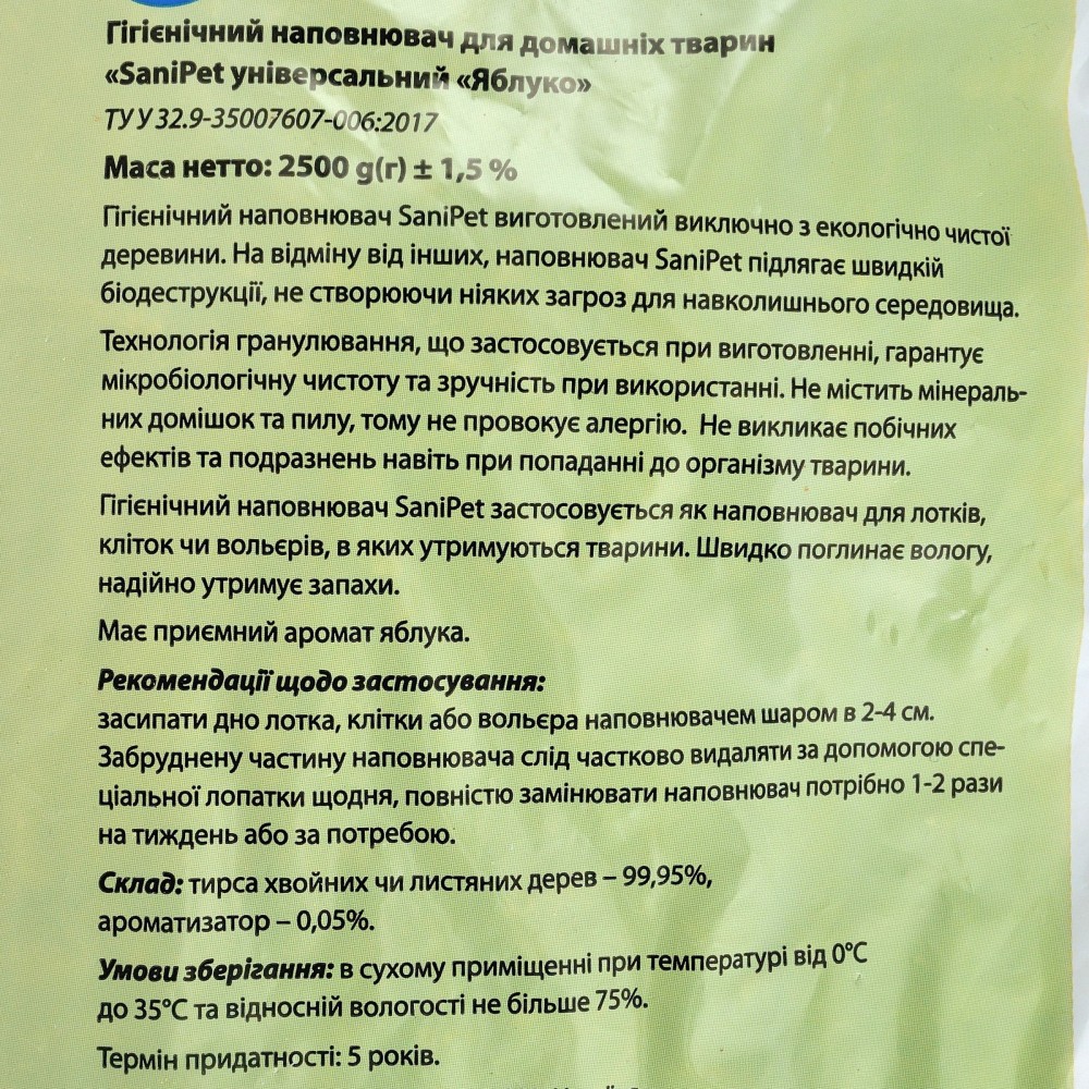 Якість продукту відповідає європейським стандартам. Сировина – виключно свіжа деревина без гнилизни та грибка. Природний фруктовий аромат приваблює тварин. Лоток після використання продукту дуже легко миється. Ваш улюбленець буде із задоволенням користуватися туалетом з таким наповнювачем.