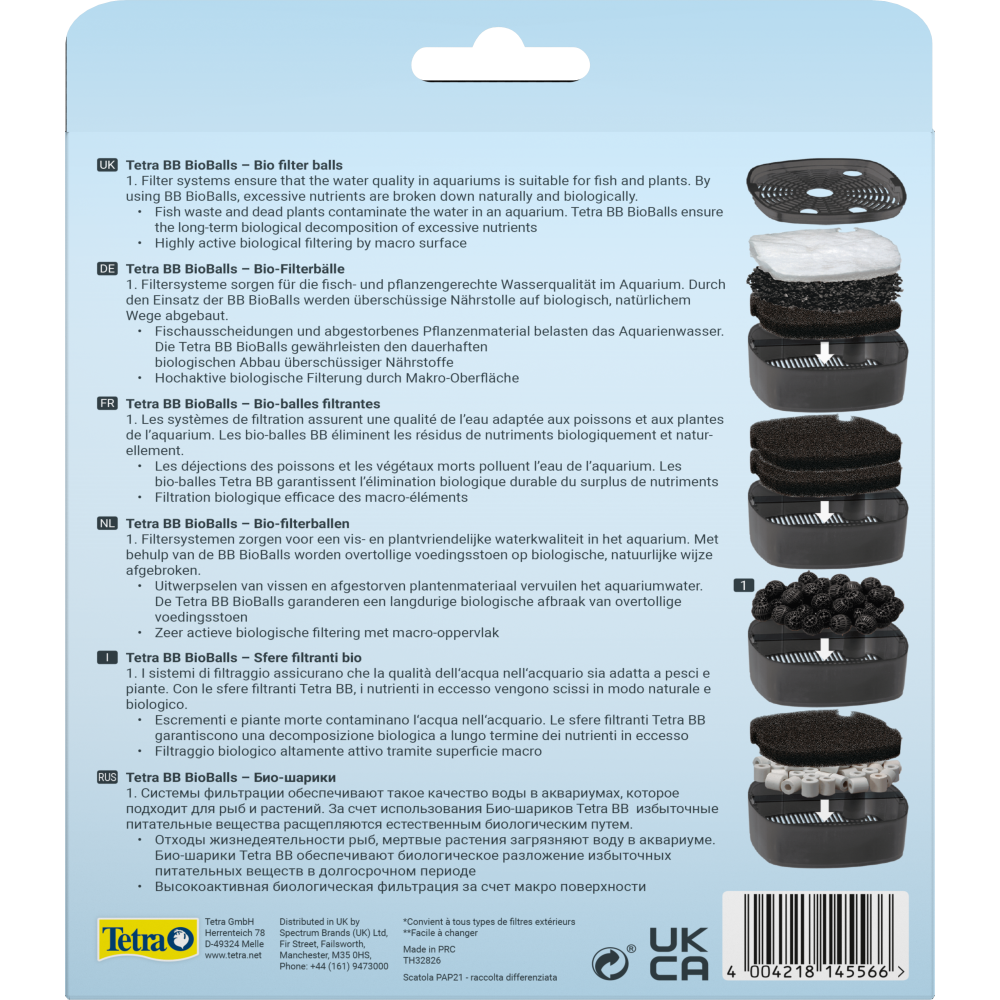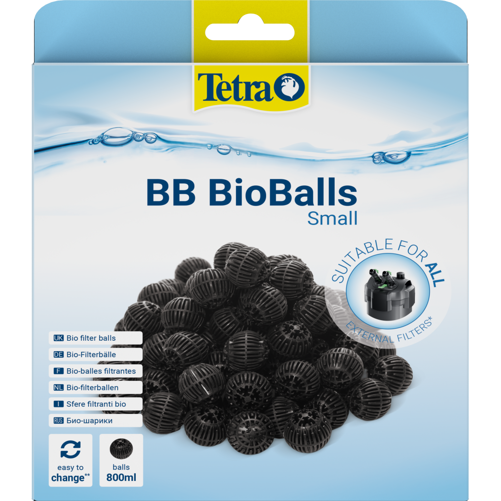 Оригінальний наповнювач фільтра Tetra «BioBalls» являє собою біо-кульки, які ефективно чистять воду, видаляючи з неї великі частки бруду. Вони охоплюють велику площу поверхні акваріума, що сприяє розмноженню потужної колонії бактерій нітрифікаторів, і біологічній фільтрації води
