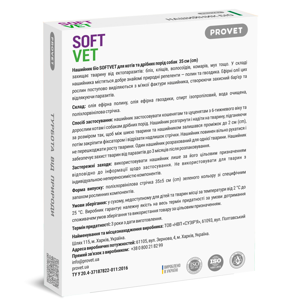 Нашийник біо SOFTVET захищає тварину від ектопаразитів: бліх, кліщів, волосоїдів, комарів, мух тощо. У складі нашийника містяться добре знайомі природні репеленти ― полин та гвоздика.