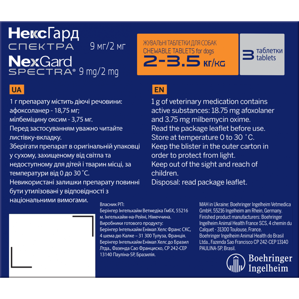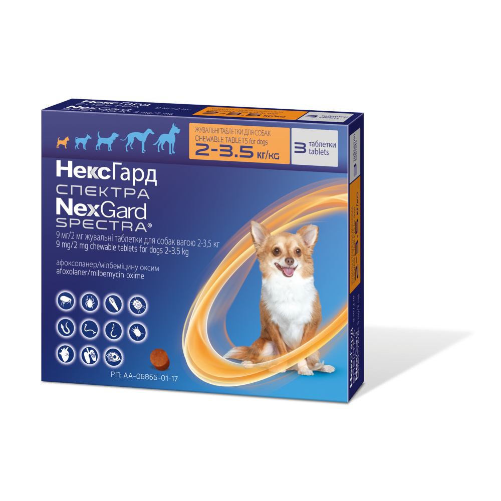 Boehringer Ingelheim НексГард Спектра - комбінований протипаразитний препарат для собак вагою від 2 до 3,5 кг. Діючі речовини, які входять до складу препарату (афоксоланер, мілбеміцину оксим), забезпечують його широкий спектр протипаразитарної дії до ектопаразитів і нематод, які паразитують у собак.