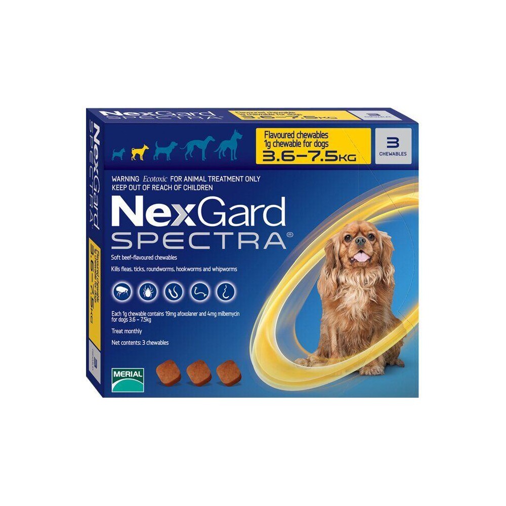 Boehringer Ingelheim НексГард Спектра - комбінований протипаразитний препарат для собак вагою від 3,5 до 7,5 кг. Діючі речовини, які входять до складу препарату (афоксоланер, мілбеміцину оксим), забезпечують його широкий спектр протипаразитарної дії до ектопаразитів і нематод, які паразитують у собак.