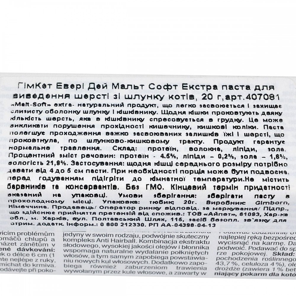 ГімКет Евері Дей Мальт Софт Екстра паста для виведення шерсті зі шлунку котів призначена для дорослих котів всіх порід, не призначена для кошенят, не призначена для котів, які мають чутливість до одного або декількох інгредієнтів кормової добавки
