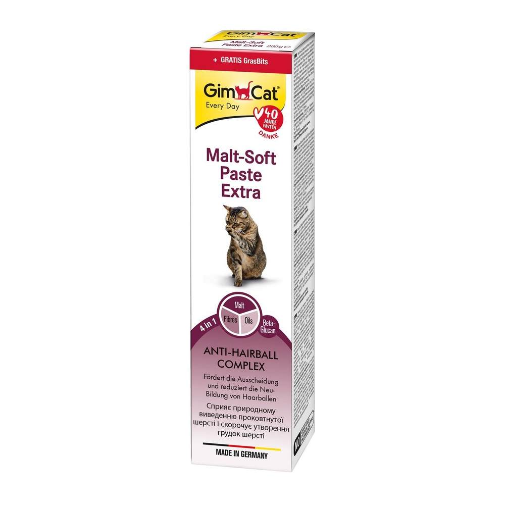 - GimCat Every Day Malt-Soft Paste Extra – це смачна паста з екстрактом солоду та корисними речовинами ефективно допомагає виводити грудочки шерсті зі шлунку. Регулярне використання пасти сприяє здоров'ю шлунково-кишкового тракту та запобігає розладам травлення.