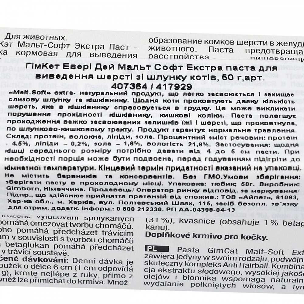 ГімКет Евері Дей Мальт Софт Екстра паста для виведення шерсті зі шлунку котів призначена для дорослих котів всіх порід, не призначена для кошенят, не призначена для котів, які мають чутливість до одного або декількох інгредієнтів кормової добавки
