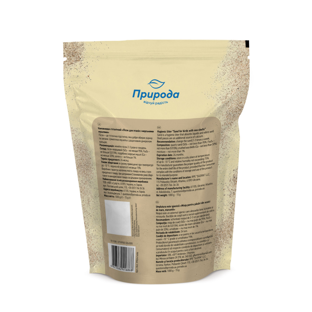 Пісок для птахів Природа з морськими мушлями 1 кг від відомого бренду зоотоварів має відмінні поглинаючі якості, завдяки чому туалет вихованця не буде перетворюватися в болото, а неприємні запахи не потривожать ваш спокій!