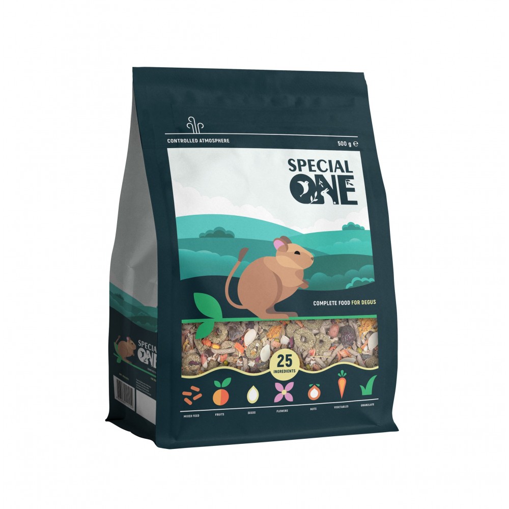 Рецептура корму розроблена спеціально для дегу, які утримуються в домашніх умовах. Вона складена на основі найновітніших світових норм годування, а також рекомендацій провідних світових фахівців з розведення та утримання дегу.