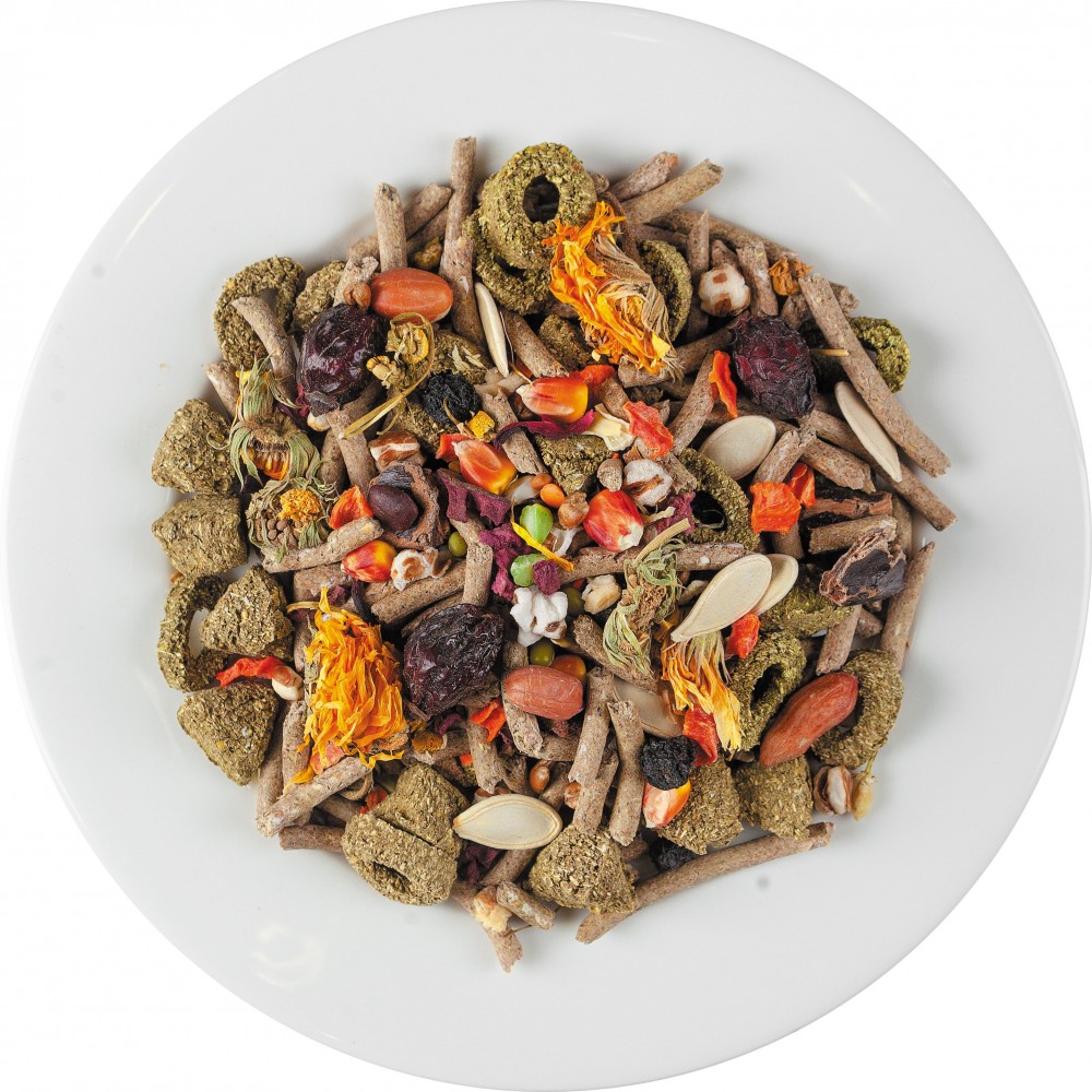 Склад: комбікорм, трав’яний гранулят в асортименті, маїс, пажитник, сушений пастернак, пшениця повітряна, кероб подрібнений, сушена морква, сафлор, горох зелений, шипшина, сочевиця червона, боби мунг, сушені яблука, насіння соняшнику, аронія, насіння розторопші, фенхель, квіти календули, кунжут чорний, арахіс, насіння гарбуза, гібіск, квіти ромашки, сушений буряк.