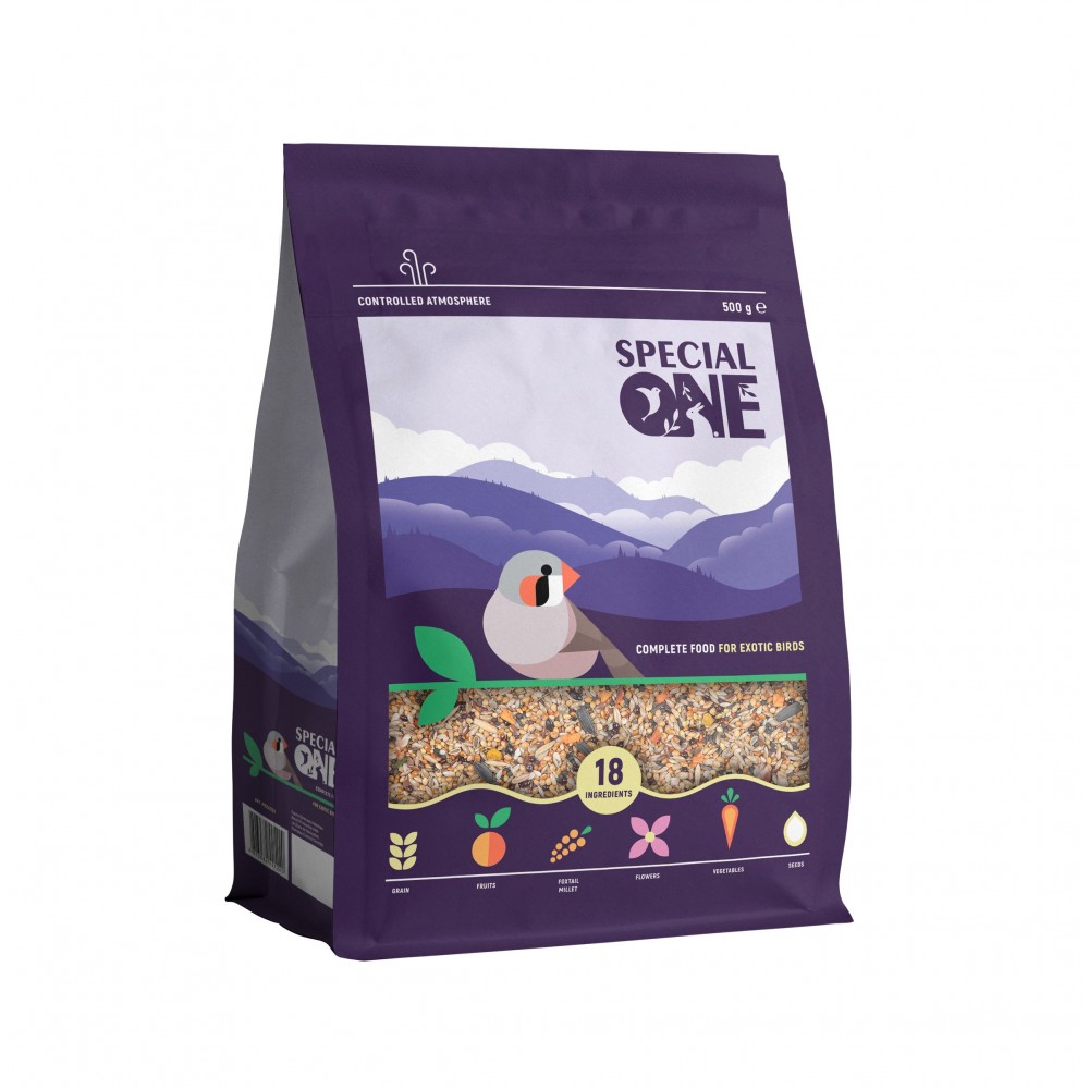 Корм має унікальний, надзвичайно багатий склад, до якого входять не лише базові інгредієнти та смаколики, але й продукти з природного ареалу проживання екзотичних птахів. До складу корму увійшло 18 інгредієнтів, серед яких високоякісне зерно, сушені фрукти, овочі, цілющі рослини, а також улюблені делікатеси – абіссінський нуг, кунжут білий, ромашка, фенхель, суданська трава. Корм збагачено інгредієнтами, які зміцнюють здоров’я, роблять оперення яскравим і прискорюють линьку.