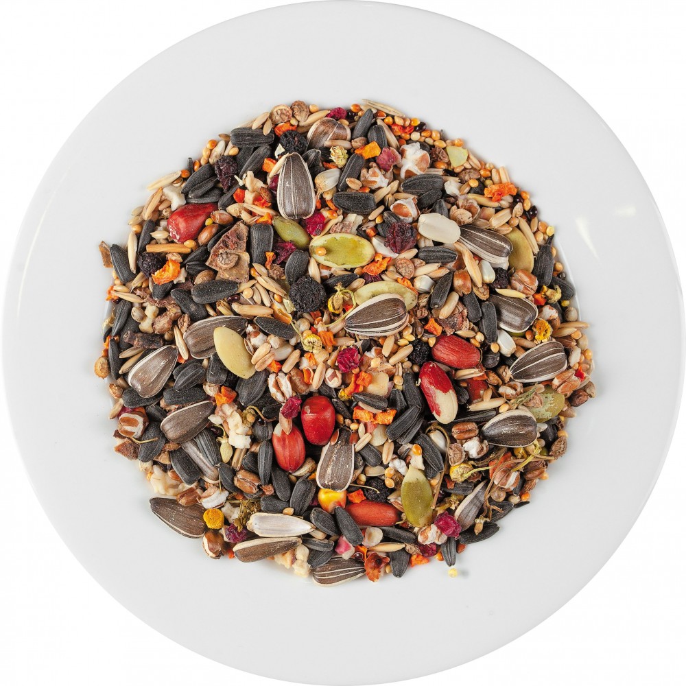 Склад: просо жовте, просо червоне, овес голозерний, насіння соняшнику, канаркове насіння, просо чорне, абіссінський нуг, полба, еспарцет, маїс, насіння льону, арахіс, сушене яблуко, насіння соняшнику сірого, боби мунг, сафлор, насіння гарбуза очищене, насіння конопель, сушена морква, повітряна пшениця, кероб подрібнений, сушена горобина, сушений барбарис, сушений виноград, квіти ромашки.