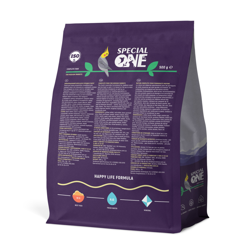 Рецептура корму розроблена спеціально для середніх папуг, які утримуються в домашніх умовах. Вона складена на основі найновітніших світових норм годування, а також рекомендацій провідних світових фахівців з розведення та утримання середніх папуг.